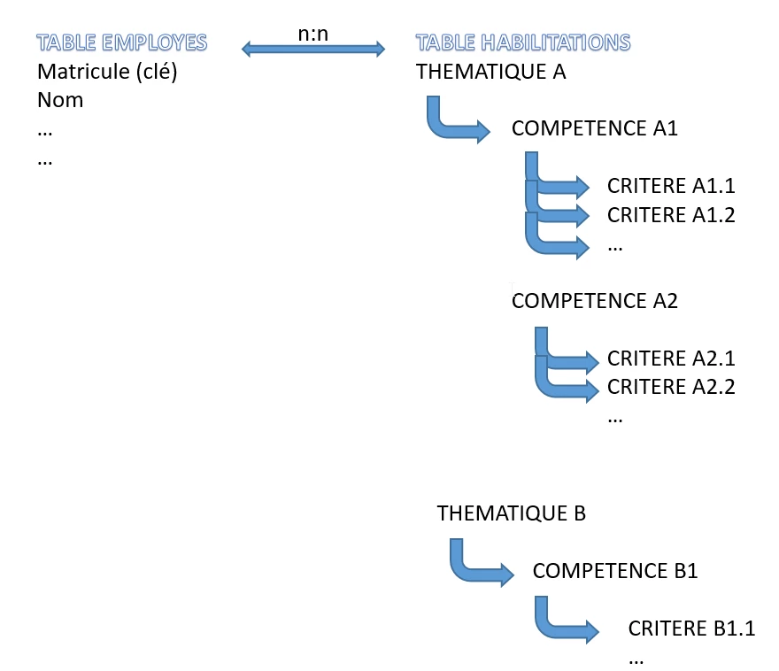 The EMPLOYEE table is easy to create, but I'm stuck on the SKILLS table because of the dependencies between themes, skills and criteria.