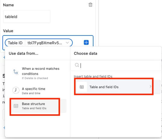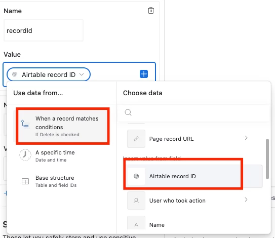 You can see how we typed in ‘recordId’ and ‘tableId’ manually, then selected the appropriate option via the dropdown menu