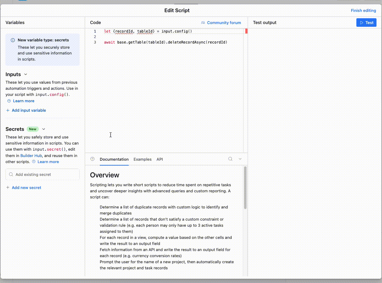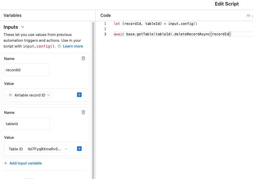 await base.getTable(tableId).deleteRecordAsync(recordId)The code uses `recordId` and `tableId`, so we’ll define those as input variables by clicking ‘Add input variable’ on the left: