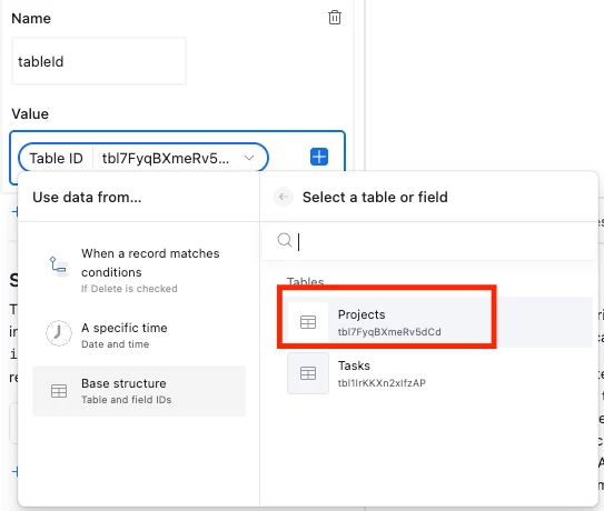 And for the tableId, we select the table that we want to delete records from, in this case, the ‘Projects’ table:
