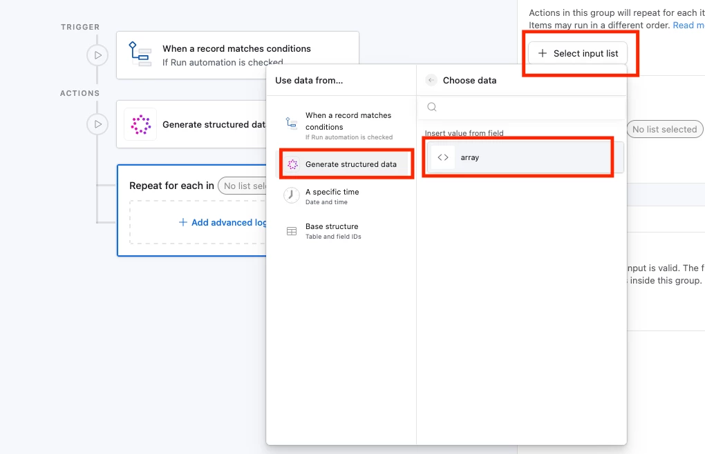 Click ‘Select Input List’, followed by the AI step, then the ‘array’ value