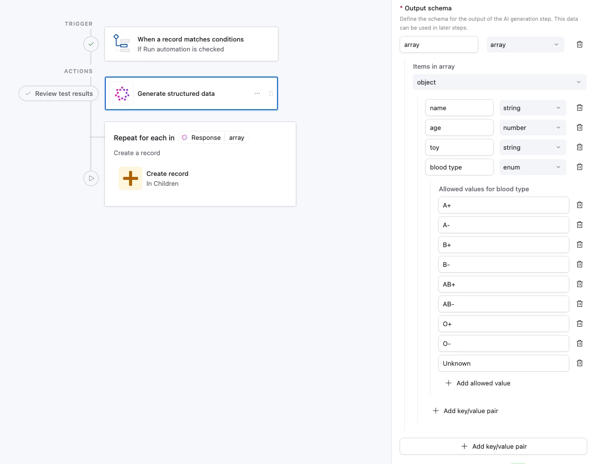 - Use the ‘Generate Structured Data with AI’ action to extract data from multiple fields