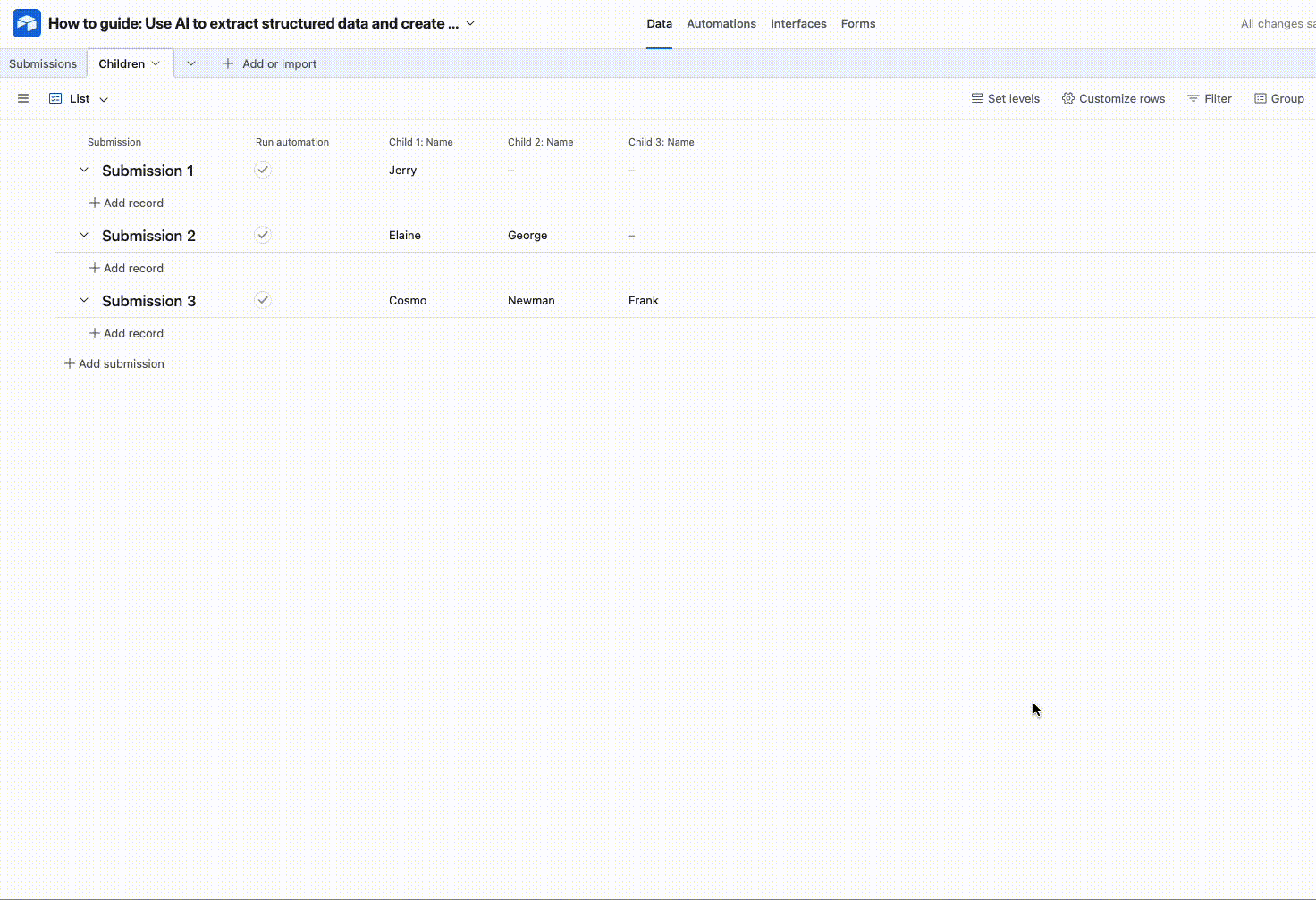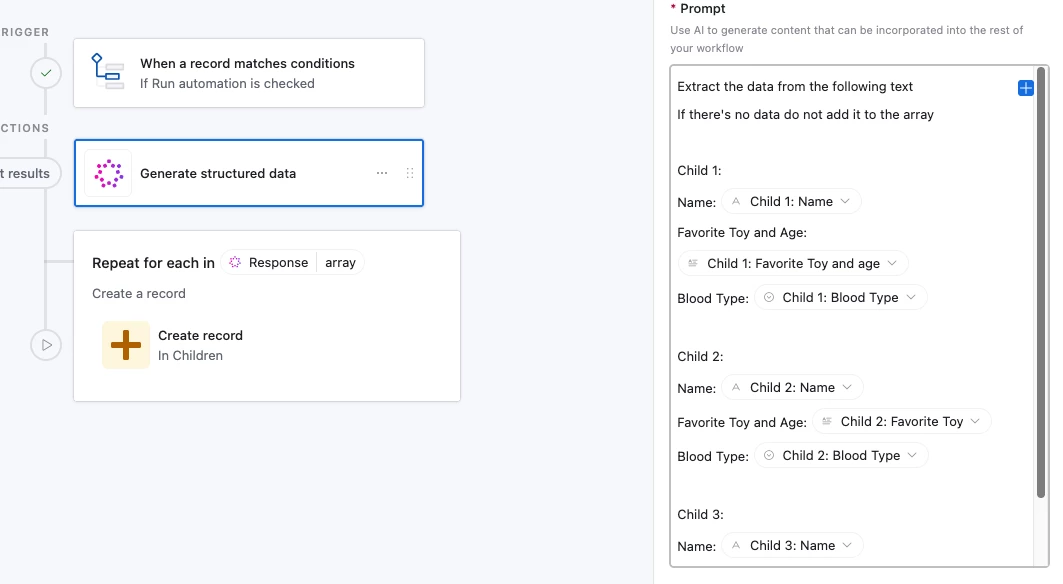 Because we’re consolidating data for multiple children, we ask the AI to return an array of objects where each object represents one child