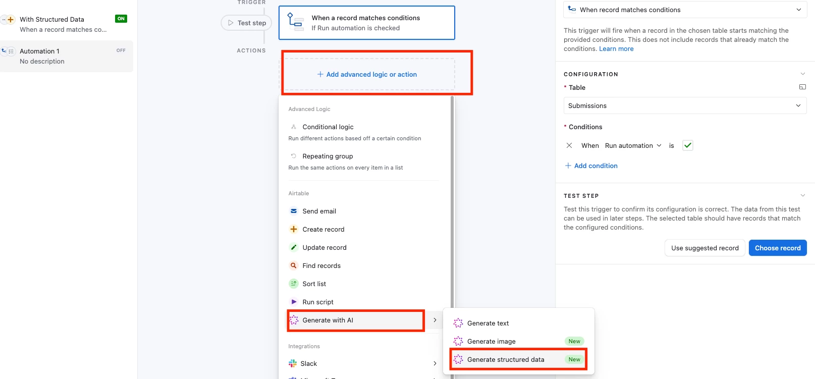 2. Add a ‘Generate structured data’ step by clicking ‘Add advanced logic or action’, hovering over ‘Generate with AI’ and then selecting it