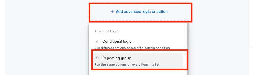 Click ‘Add advanced logic or action’, then select ‘Repeating group’