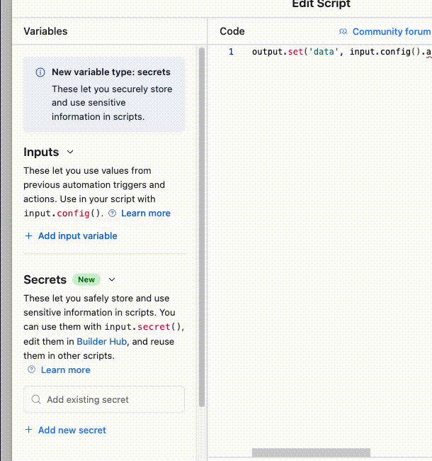 - Pass the AI generated text into the script action by adding it as an input variable on the left. We’ll call it ‘aiOutput’ and select the AI generated response like so: