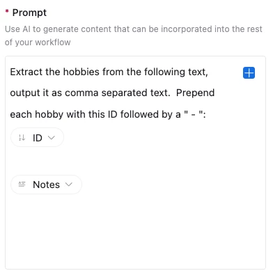 - “Extract the hobbies from the following text, output it as comma separated text”