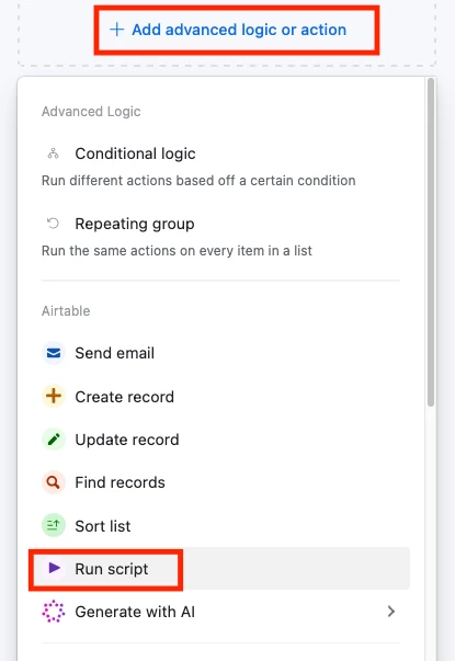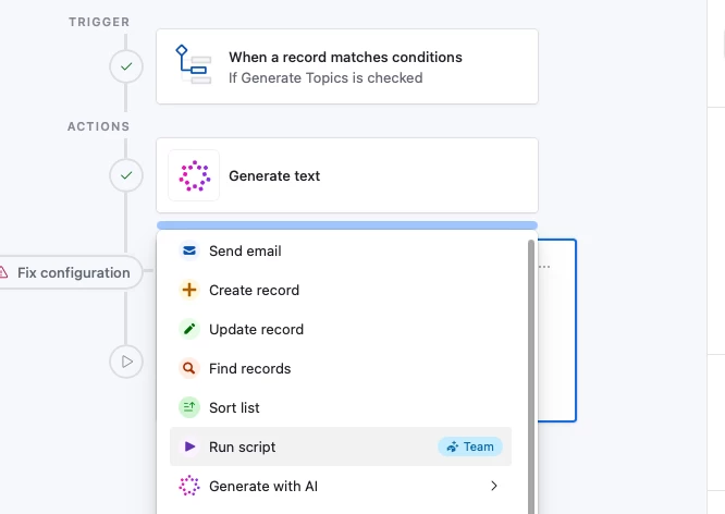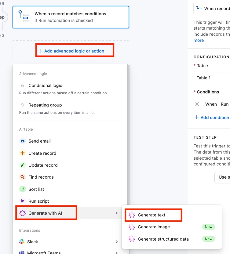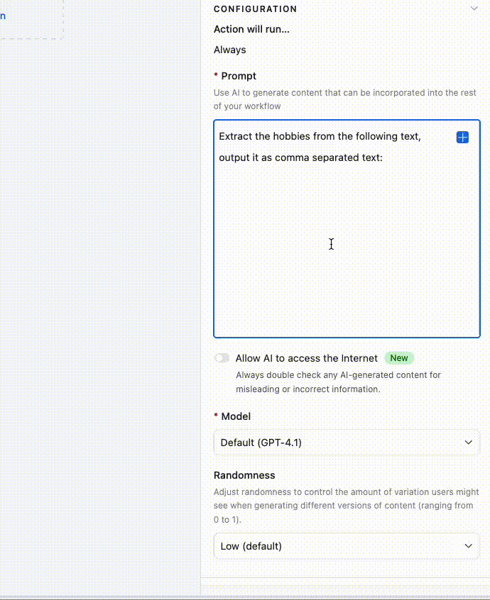 - Select ‘Add action’, then ‘Generate with AI’, followed by ‘Generate text’:
