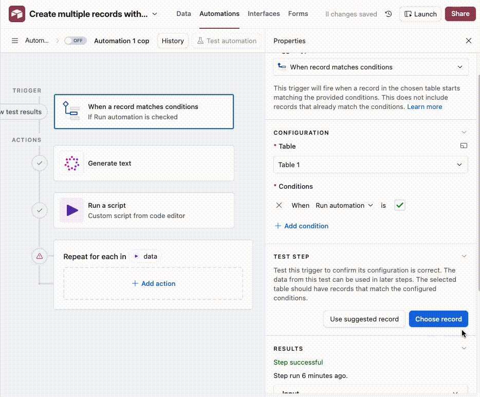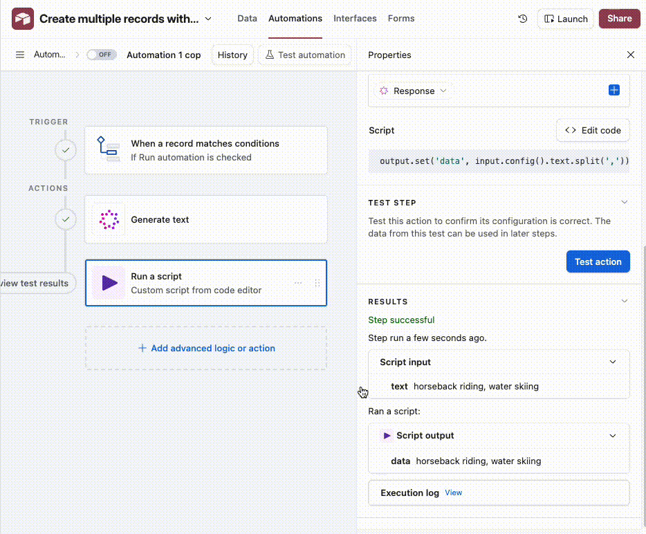 Here we’re converting the AI’s comma-separated response into an array we can loop over in a repeating group