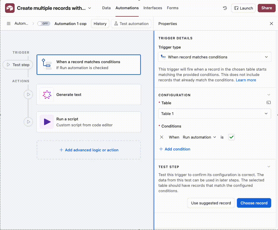 - Add the ‘Table 1’ field and set it to be the triggering record’s ID
