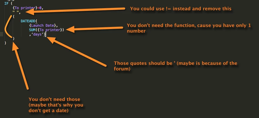 The formula I’ve been trying is IF ({To printer}=0," ",(DATEADD({Launch Date},SUM({To printer}),‘days’))). It works - but the date field is a long integer and not a formatted date.