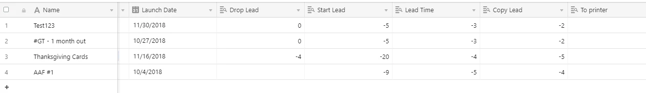 Thanksgiving Cards - Launch date is 11/16/2018. I want to create a “to printer” field that subtracts 4 days from the launch date to create a new “to printer field” that shows a due date of 11/09/18 and leaves the others blank