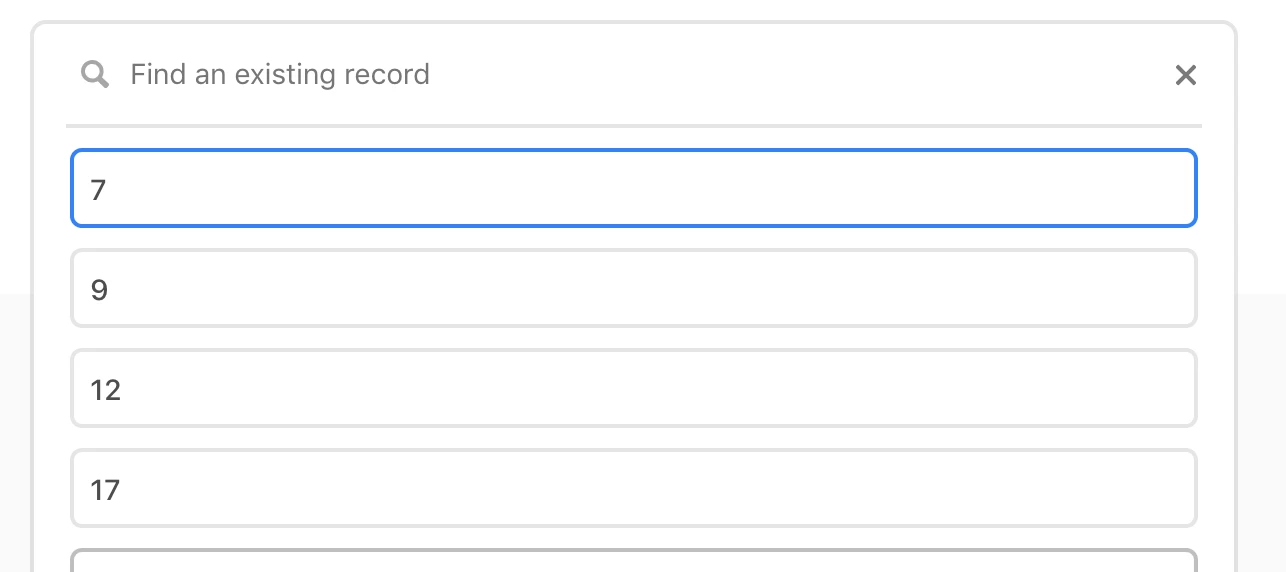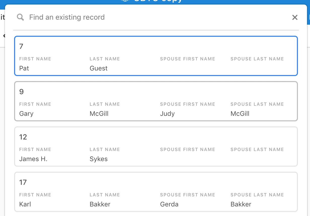 In the form edit view, a record selector shows multiple fields, nicely formatted: