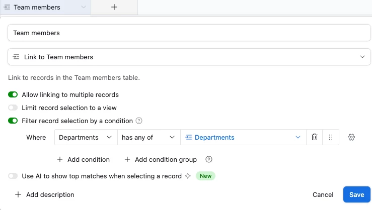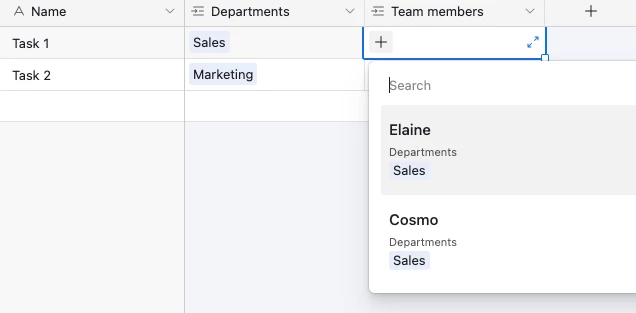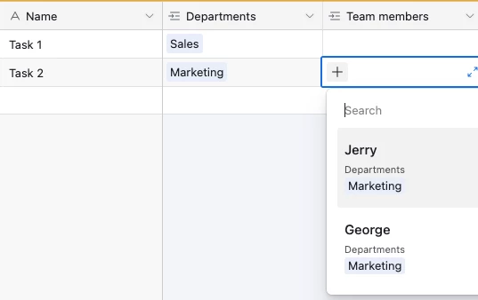 For example, if you want to be able to select a Department and then only be provided the Team Members that are part of the department like so: